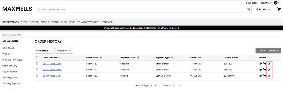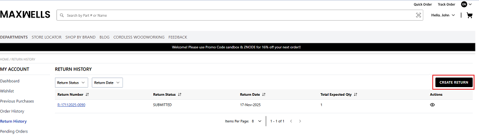 Navigate to the Orders History page and click on the Create Return icon for the respective Order, OR