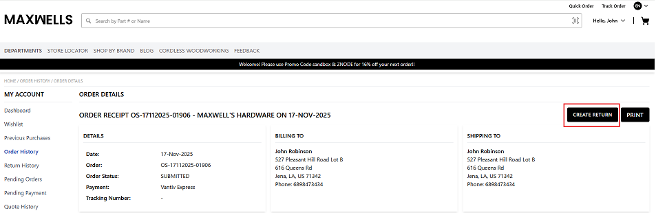 Guest Buyers can create Returns for their Orders from the Order Tracking page using the Create Return button.