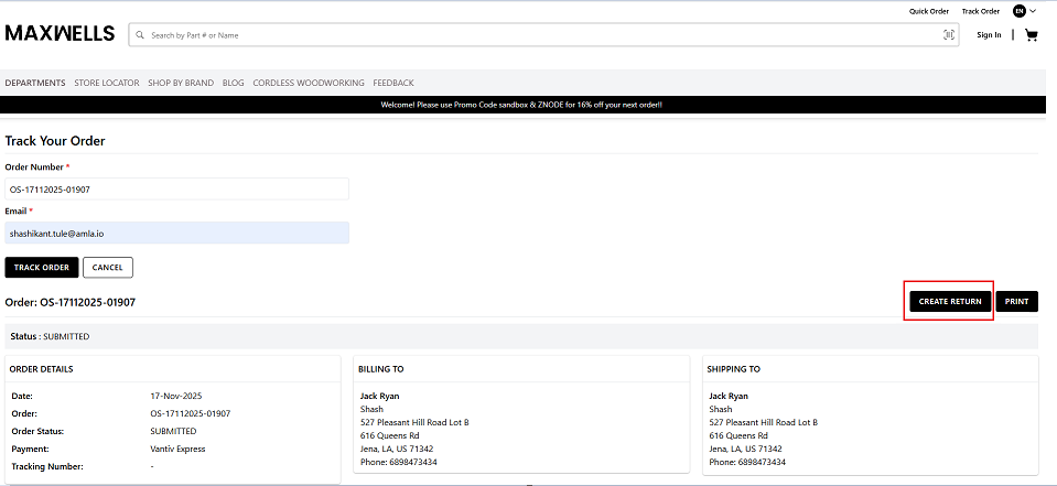 Navigate to the Track Order page and track an Order associated with the respective logged-in buyer’s account, and click on the Create Return button OR