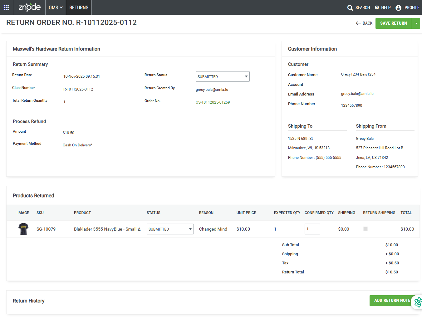 Navigate to: OMS > Returns > “View” Action