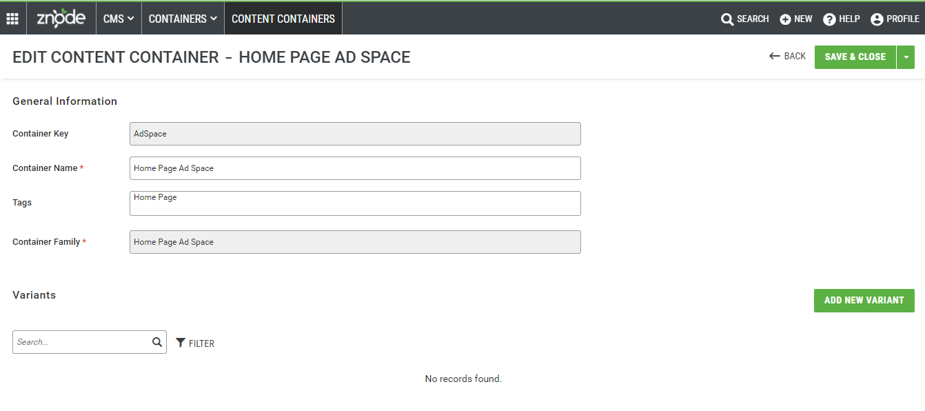 - Click on Save or Save & Close. When the administrator clicks on save, the container data along with the default variants is saved and administrators get redirected to the Edit container variant screen. When the administrator clicks on save & close, the container data along with the default variants is saved and administrators get redirected to the Edit container screen.