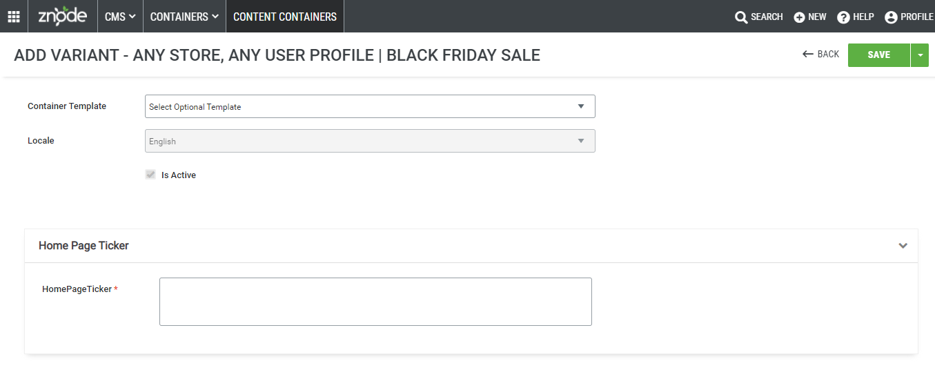 Notes:- Unless the data for the default variant i.e. “Any Store, Any User Profile” is added for the default locale, Content Container cannot be created