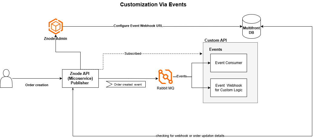 Note : This Event Consumer will work only if the custom API application is hosted within the Kubernetes cluster of the Znode BlackBox environment. (The RabbitMQ connection string pointing to the cluster's RabbitMQ pod is configured for the Custom API by the Znode DevOps team.)