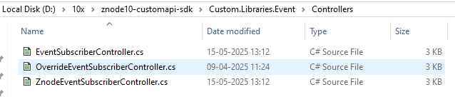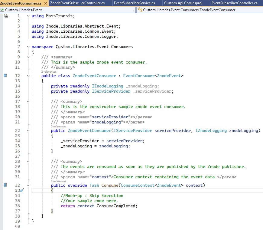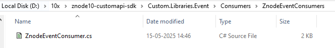 - Once the Custom API SDK is set up locally, a library called Custom.Libraries.Event is automatically added to the project. This library includes consumers used for creating znode event samples.