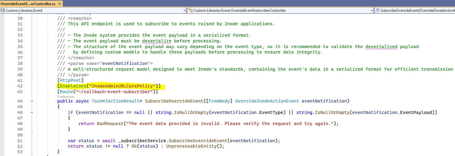 - If the Webhook URL has the route flash-event-subscriber, the SubscribeZnodeEvent method in the ZnodeEventSubscriberController will be invoked.