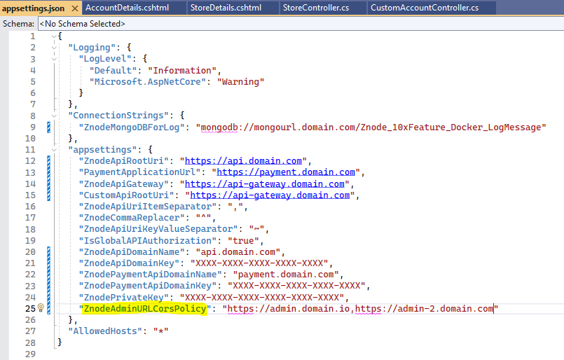 - Znode Admin URL is added to CORS policy in appsettings.json under ZnodeAdminURLCorsPolicy.