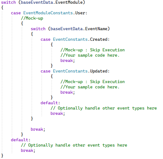- Within your API, you can handle events using switch on EventType and EventName to apply specific business logic: