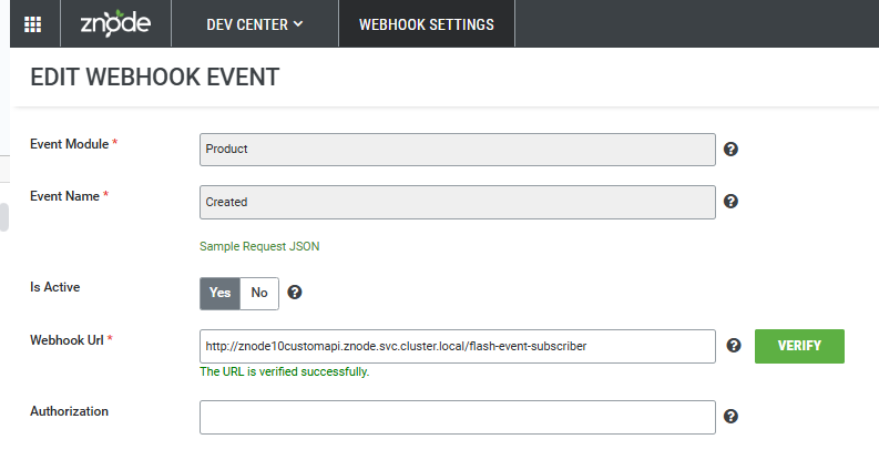 - Authorization : API key or token for webhook authentication. It is optional. This can be used when accessing the webhook URL directly—without going through API gateways—or when the Custom API is hosted outside the Znode AKS Cluster and requires a separate authorization header..