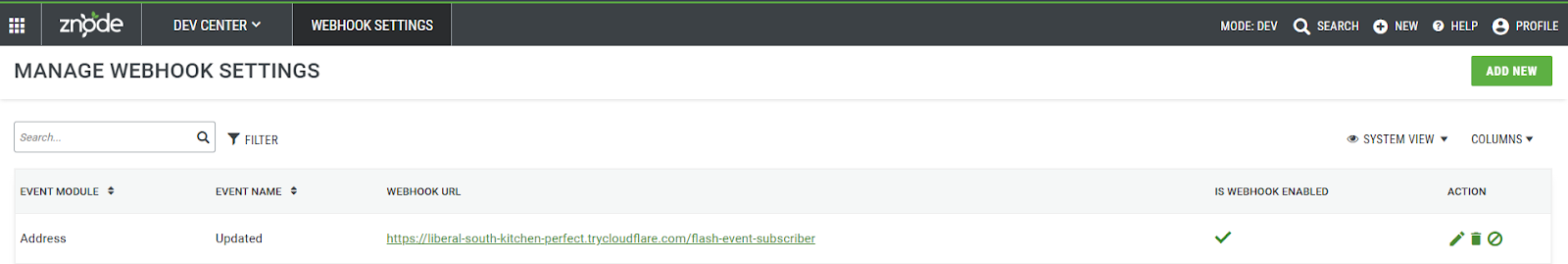 - Clicking on the “Edit” button opens the “Edit Webhook Event” page to edit the configurations against the selected record
