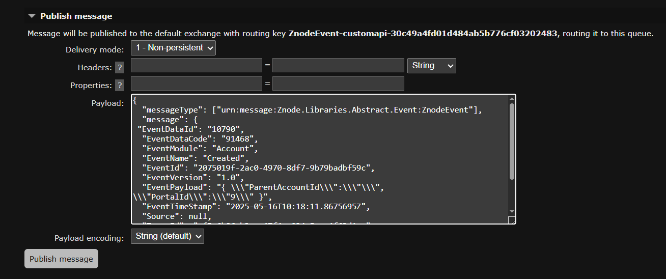 - Steps for publishing ZnodeEvent from the RabbitMQ Management UI for testing purposes