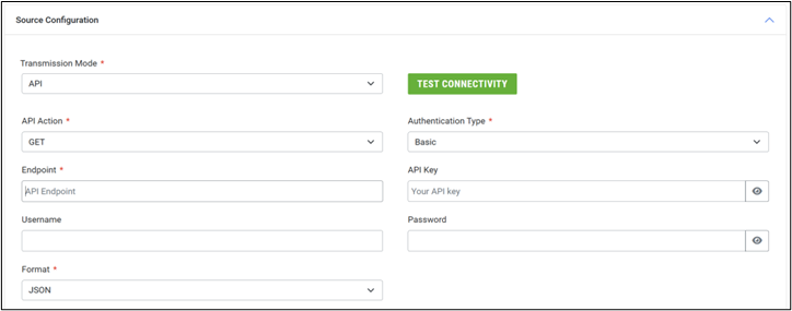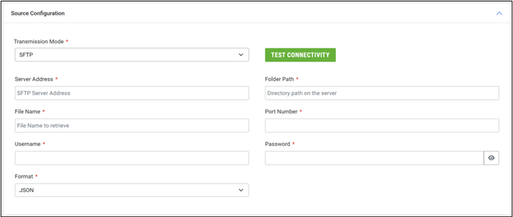 The “Test Connectivity” action is available regardless of the transmission mode selected. After all credentials have been added, a user may test the connectivity to the configured server using the configuration details. A confirmation message will be displayed with the results of the test.