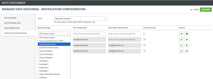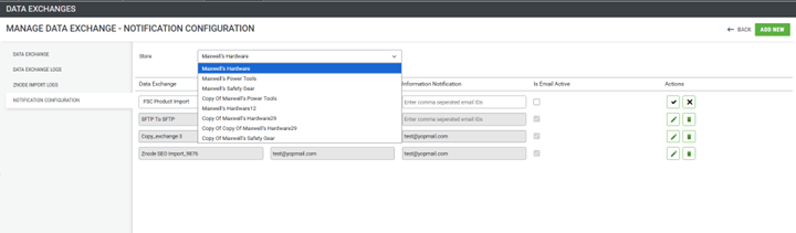 To add data exchanges for email notifications, click the ADD NEW button. This will display a list of data exchanges not yet configured for notifications. Select the desired data exchange, add the recipient emails, and click the tick mark to add it to the notification list.