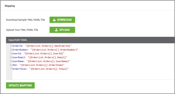A user may edit the Input/Edit YAML dialog directly and select the “Update Mapping” action to save the mapping changes. Else, the Znode admin tooling provides the ability to “Download” a sample YML/YAML file to assist in creating a custom mapping YML/YAML file.