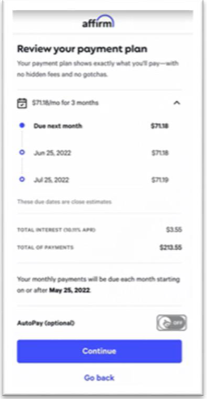 - Selecting this payment method will open an iframe rendered from Affirm.
