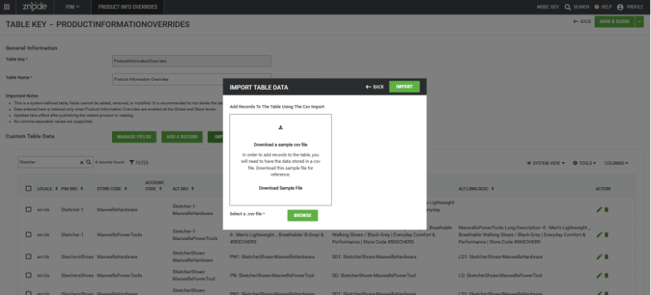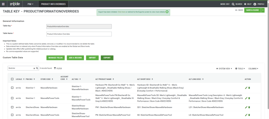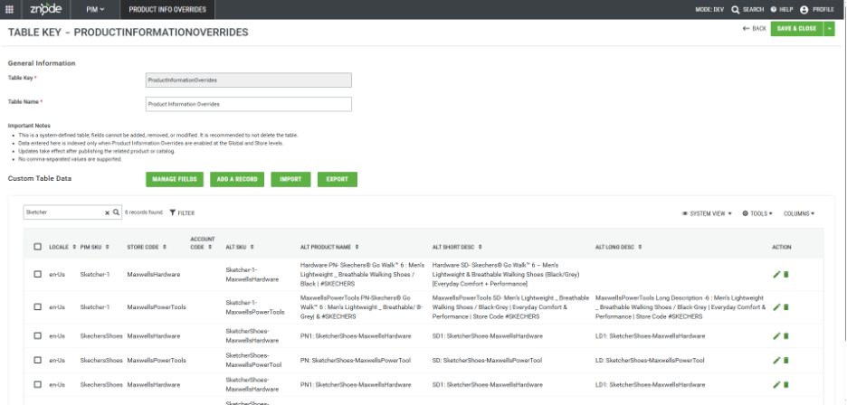 - Product Information Override data is stored in a Custom/System Table. Each record must be uniquely defined based on the combination of: